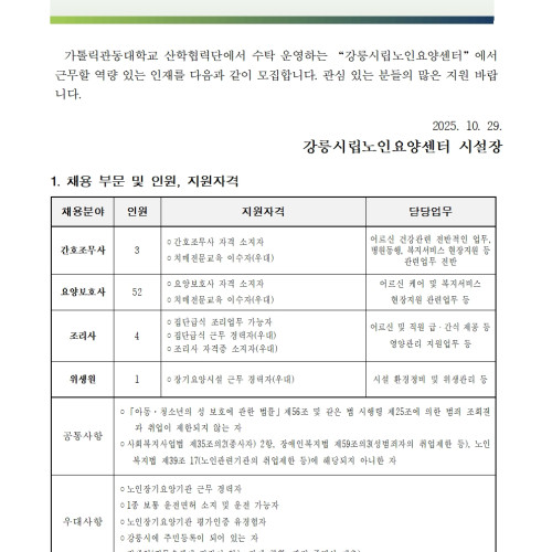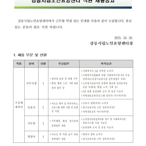 강릉시립노인요양센터 상시채용 공고문(간호조무사, 요양보호사, 조리사, 위생원)